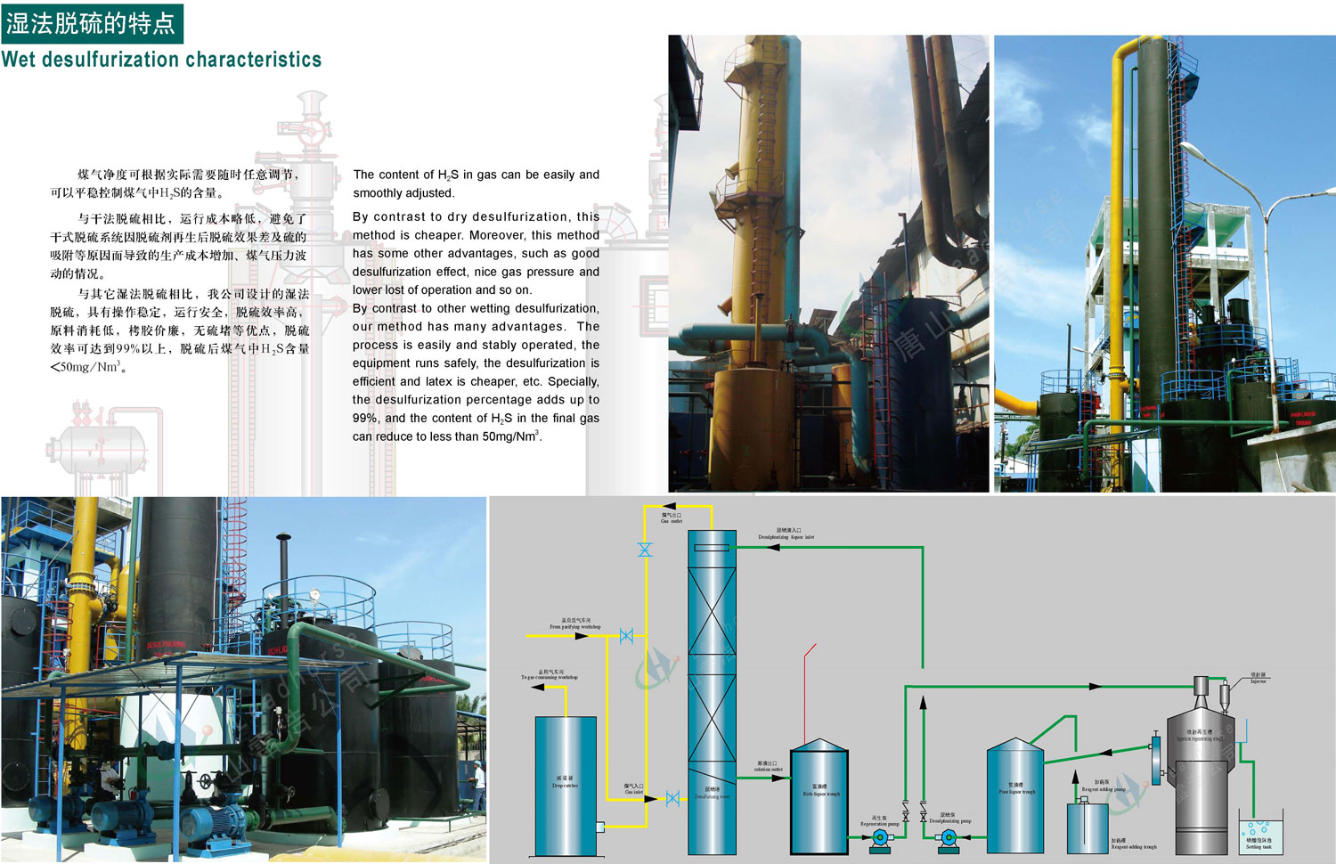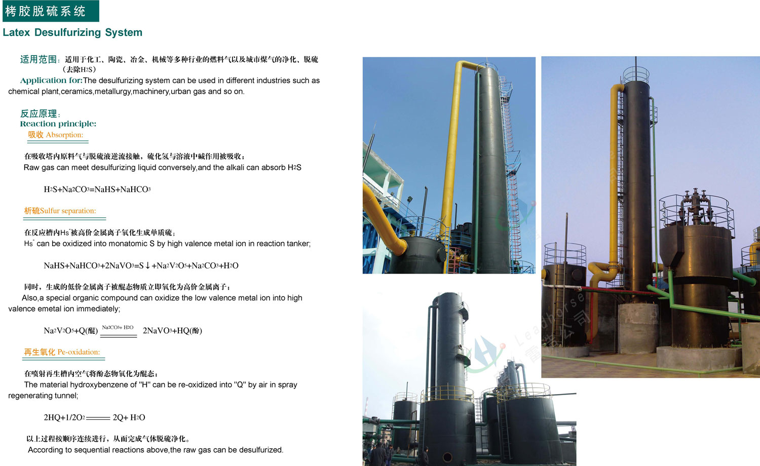 適用范圍:適用于化工、陶瓷、冶金、機(jī)械等多種行業(yè)的燃料氣以及城市煤氣的凈化、脫硫(去除H2S) 反應(yīng)原理:(1)吸收:在吸收塔內(nèi)原料氣與脫硫液逆流接觸,硫化氫與溶液中堿作用被吸收;H2S+Na2CO3=NaHS+NaHCO3 (2)析硫:在反應(yīng)槽內(nèi)Hs被高價(jià)金屬離子氧化成為單質(zhì)硫;NaHS+NaHCO3+2NaVO3=S↓+Na2V2O5+Na2CO3+H2O同時(shí),生成的低價(jià)金屬離子被醌態(tài)物質(zhì)立即氧 化為高價(jià)金屬離子;Na2V2O5+Q(醌)NaCO3+H2O 2NaVO3+HQ(酚) 再生氧化:在噴射再生槽內(nèi)空氣將酚態(tài)物氧化為醌態(tài);2HQ+1/2O2 2Q+H2O 以上為過程按順序連續(xù)進(jìn)行,從而完成氣體脫硫凈化。